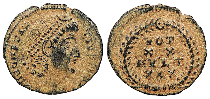AE4 16mm. 1.21g. Antioch Mint 347-348 A.D. Pearl-diademed head, r. D N CONSTAN-TIVS P F AVG Legend in four lines within wreath; In ex.: [SMANA]? VOT/XX/MVLT/XXX cf. RIC VIII 113 Near EF. Dark patina with attractive reddish earthen fill. Excellent portrait detail. Though the mint mark is off the flan, this type and style is indicative of Antioch.