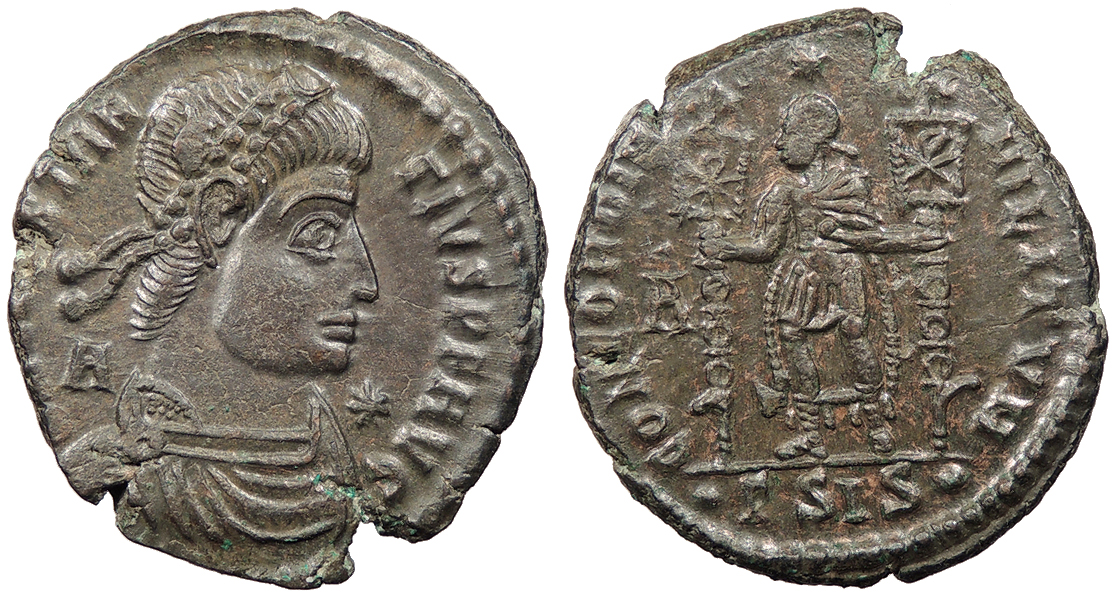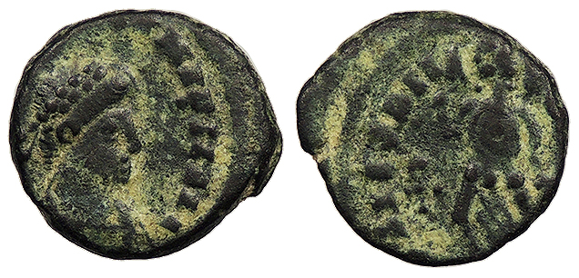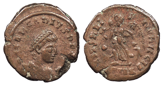 AE4 12mm. 1.32g. Thessalonica Mint (?) 388-393 A.D. Pearl-diademed, draped and cuirassed bust, r. [DN VALENTINIA]NVS PF AVG Victory advancing l., head r., carrying trophy on shoulder and dragging captive; Christogram in l. field; In ex.: [TESA] (?) [S]ALVS REI-[PVBLICAE] cf. RIC IX 65a VF. Scarce. Dark green contrasting patina. Good detail. Off-center on tight flan. Slight roughness. Possible Vandallic imitation. Though the mint mark is off the flan, an attribution to Thessalonica can be made based upon stylistic details. However, the crude, small legends could also indicate a Vandallic origin, in which case this would likely be an imitation of Valentinian III.