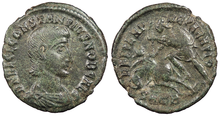 AE Centenionalis 18mm. 2.60g. Siscia Mint 351-354 A.D. Draped and cuirassed bust, r. D N CONSTANTIVS NOB C Helmeted soldier advancing l., spearing fallen horseman wearing pointed cap and turning to face soldier; In ex.: BSIS FEL TEMP REPARATIO RIC VIII 351 Fine. Green patina with coppery brown high points. Some light porosity.