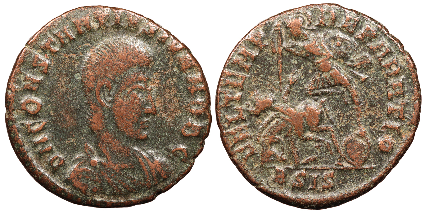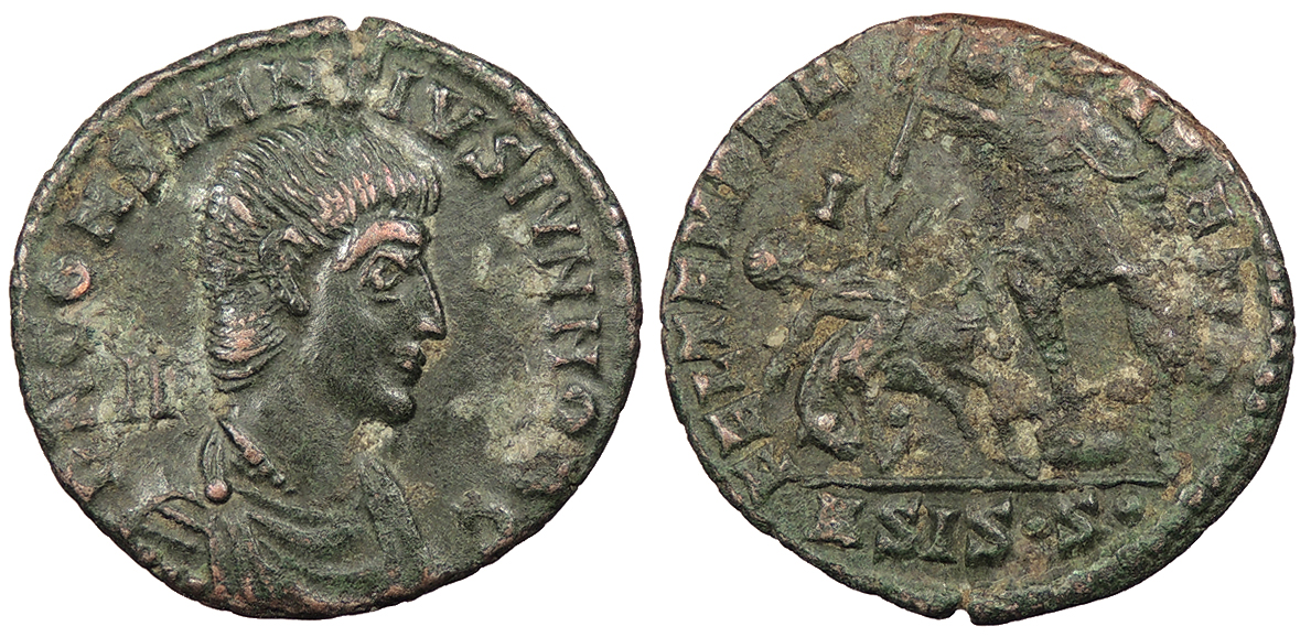 AE Follis 22mm. 3.77g. Siscia Mint 351-354 A.D. Bare-headed, draped and cuirassed bust, r.; A behind. D N CONSTANTIVS IVN NOB C Helmeted soldier to l., spearing fallen horseman who turns to solider and raises arm; I in l. field; In ex.: ASIS.S. FEL TEMP REPARATIO RIC VIII 347 VF. Scarce. Dark green patina with some coppery high points. Light roughness.