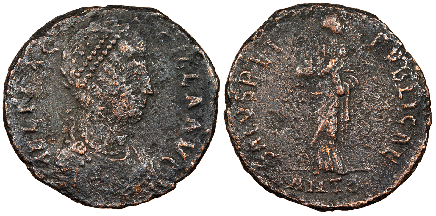 AE2 22mm. 5.10g. Antioch Mint 383-388 A.D. Draped bust, r., with elaborate head-dress, necklace, and mantle. AEL FLAC-CILLA AVG Empress standing facing, head r., arms folded at breast; In ex.: ANTE SALVS REI-PVBLICAE RIC IX 62 Near VF. Dark brown patina. Scarce. Porous. Listed as 'scarce' in RIC.