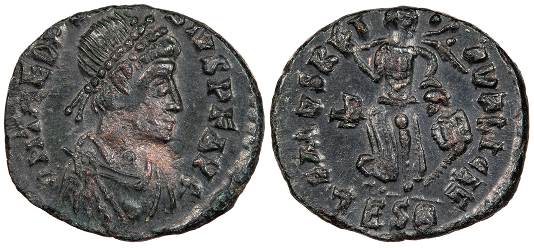 AE4 13mm. 1.20g. Thessalonica Mint 388-393 A.D. Pearl-diademed, draped and cuirassed bust, r. DN THEODO-SIVS PF AVG Victory advancing l., head r., carrying trophy over r. shoulder and dragging captive with l.; chi-rho in l. field; In ex.: TESB SALVS REI-PVBLICAE RIC IX 65b EF. Nearly black patina. Excellent strike and superb fields, far better than average for the issue. Area of patina loss on obverse. Tiny bright scratch on reverse. Listed as 'scarce' in RIC.