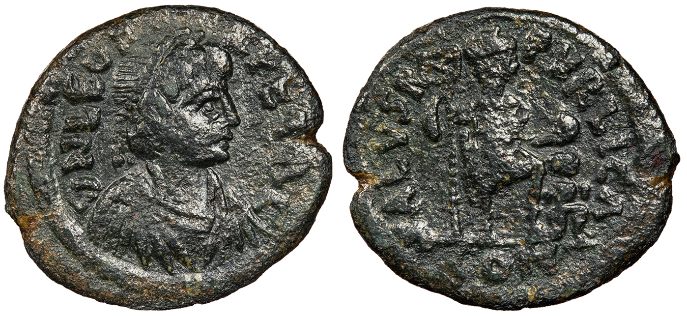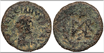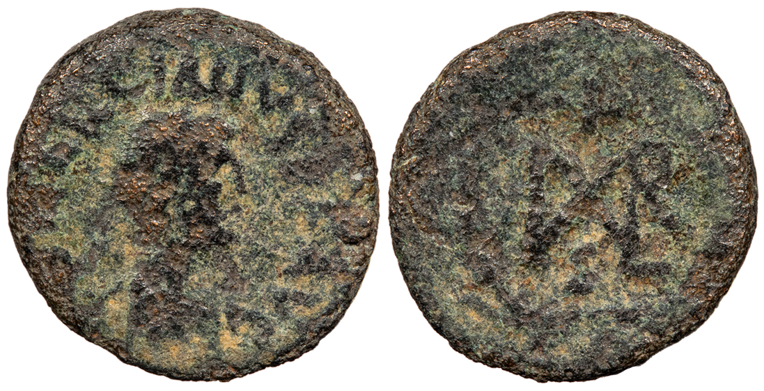 RIC X 545 Fine. Dark green-brown mottled patina. Some wear and slight roughness, but otherwise clear legends and monogram.
