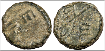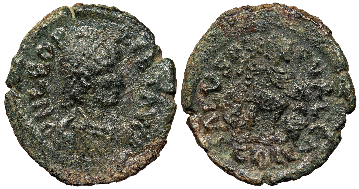 cf. RIC X 440-455 Fine. Possible Vandals issue. Dark patina with some reddish fill. Off-center and crudely made. Small coppery friction spot on edge. While the miniscule size and weight, crude manufacture, and lack of ornamentation at the bottom of the wreath could indicate a Vandallic origin, the delicate style on the reverse is more typical of an official issue.