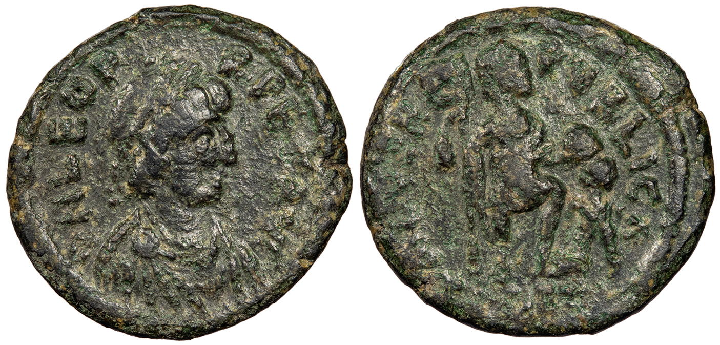 cf. RIC X 713ff. VF. Brown-green patina. Off-center on very tight flan. Though no mintmark is visible, the legend break on the obverse is attributed to Constantinople, which is also the most common and most likely mint.