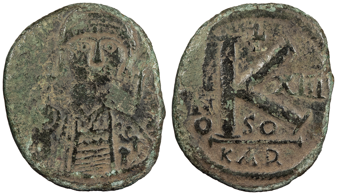 AE Half Follis (20 Nummi) 29mm. 9.40g. Carthage Mint RY 13 (539/40 A.D.) Diademed, draped and cuirassed bust, r., holding globus cruciger and shield; cross to r. DN IVSTINIANVS PP AVG Large K, A/N/N/O to l., XIII to r., cross above, SO below; In ex.: KAR