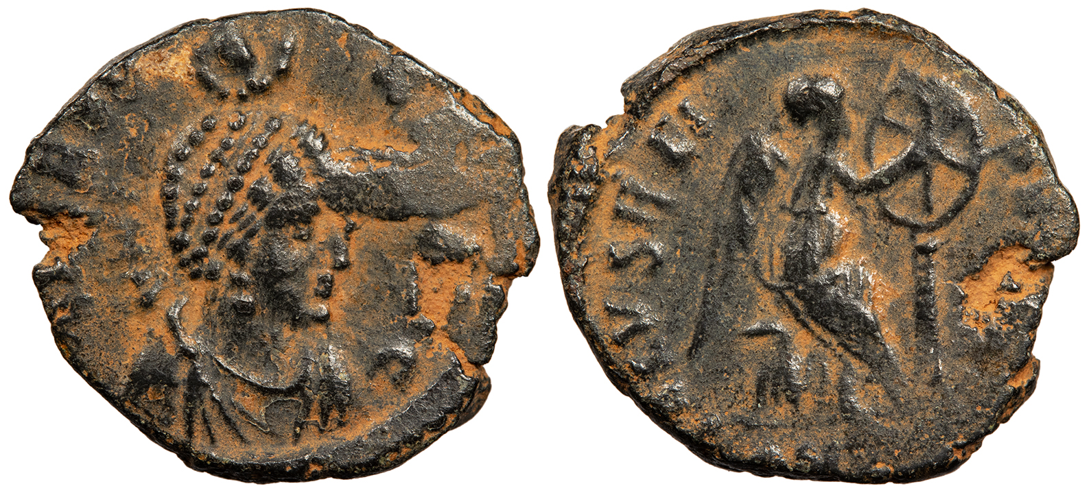 AE3 17mm. 2.40g. Antioch Mint 401-403 A.D. Pearl-diademed, draped bust r., wearing necklace, earrings, and being crowned by the hand of God above. AEL EVDO-XIA AVG Victory seated r. on cuirass, supporting on low column a shield inscribed with chi-rho; In ex.: ANT(gamma) SALVS REI-PVBLICAE RIC X 104 VF. Dark patina with reddish earthen fill. Irregular flan. Struck with broken obverse die.