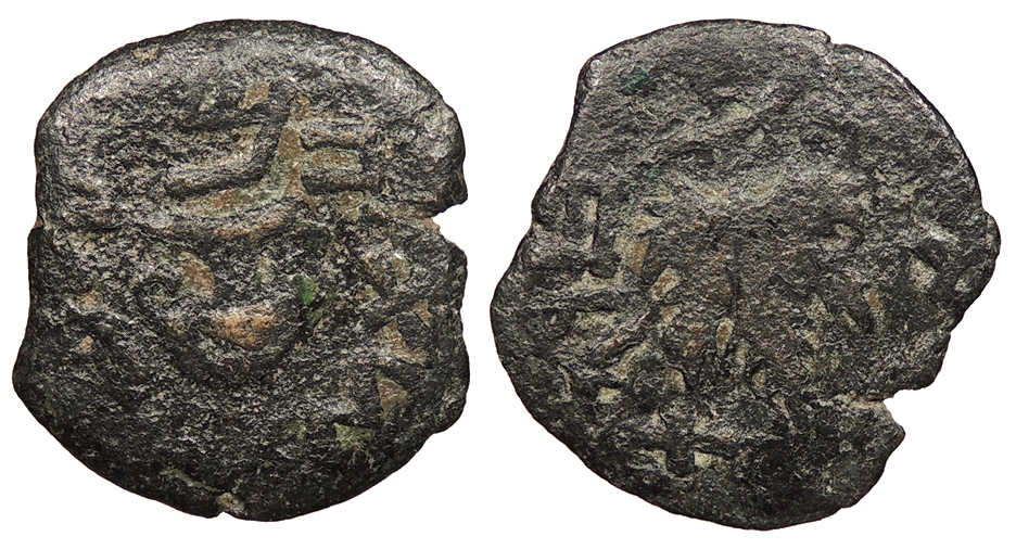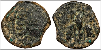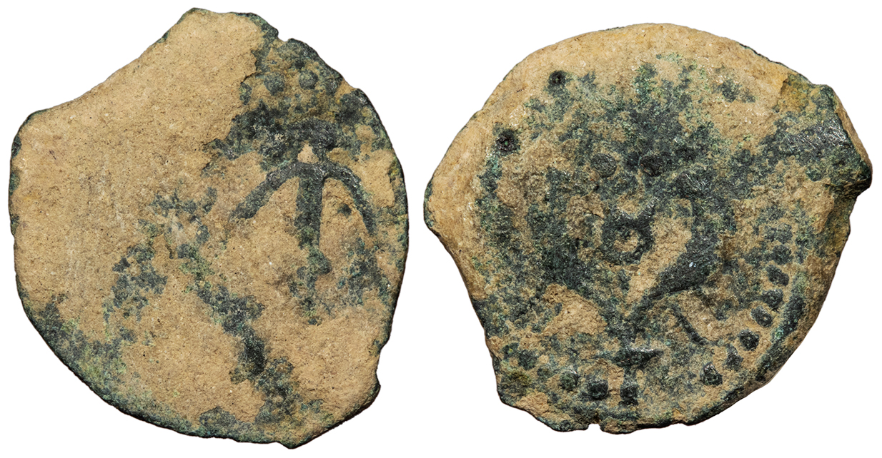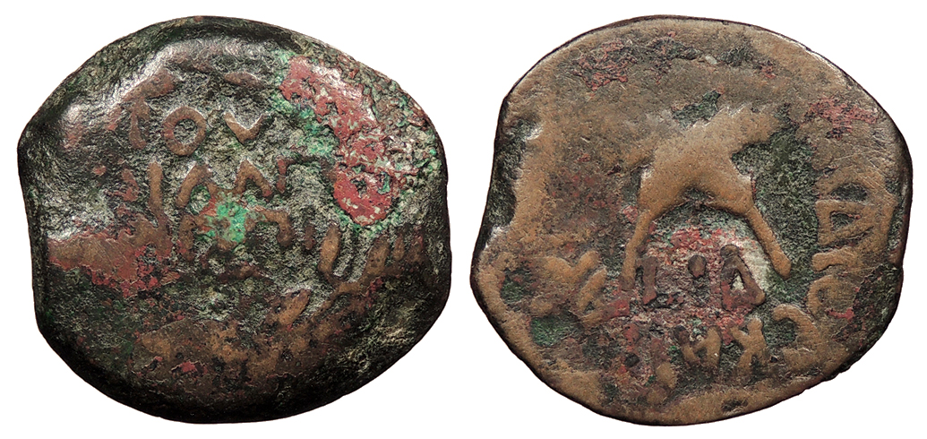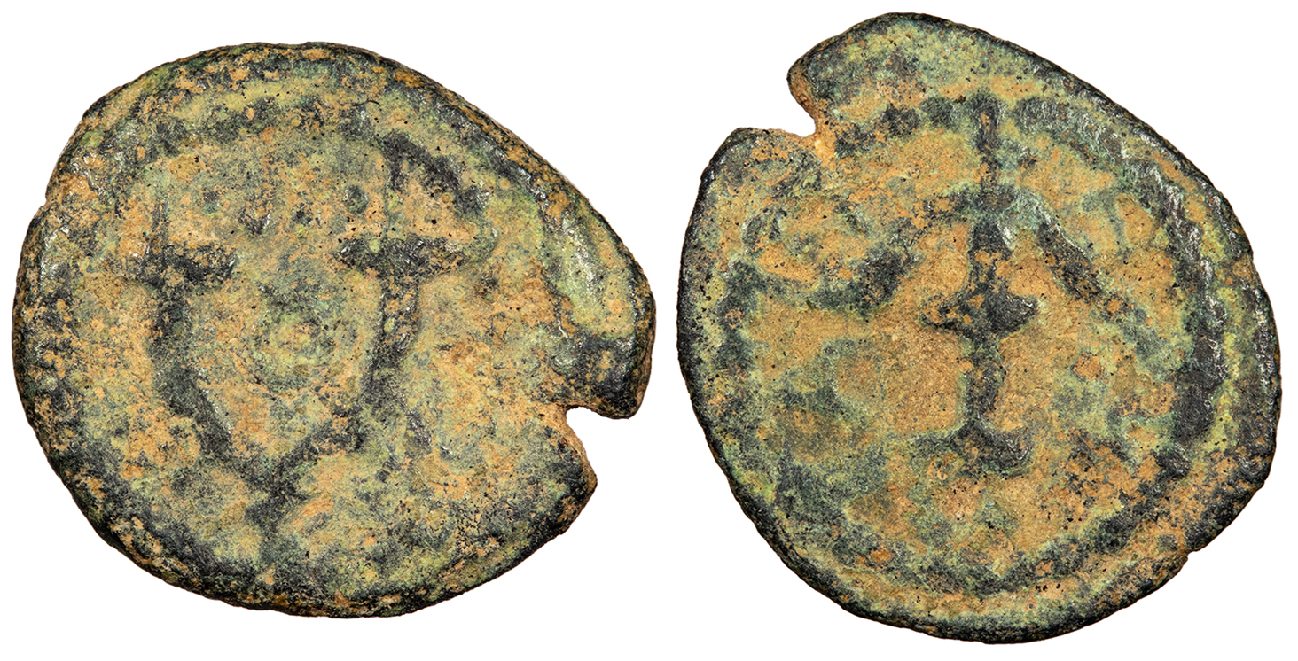Hendin 6219 Fine. Gray-green patina with much tan earthen fill. Obverse off-center. Minor roughness, as typical. This issue may be related to the founding of Herod’s port at Caesarea Maritima, 22-10 B.C.