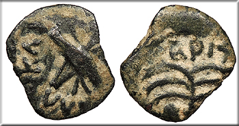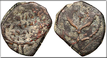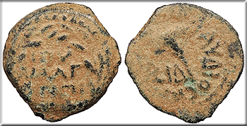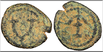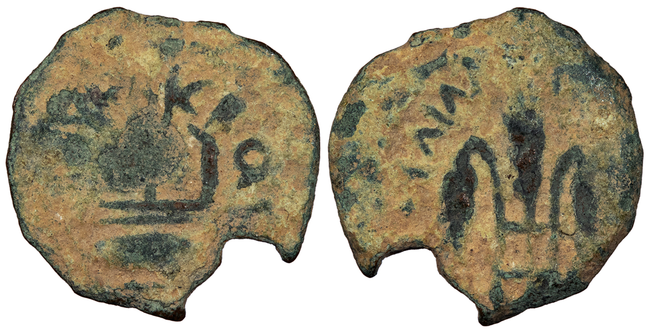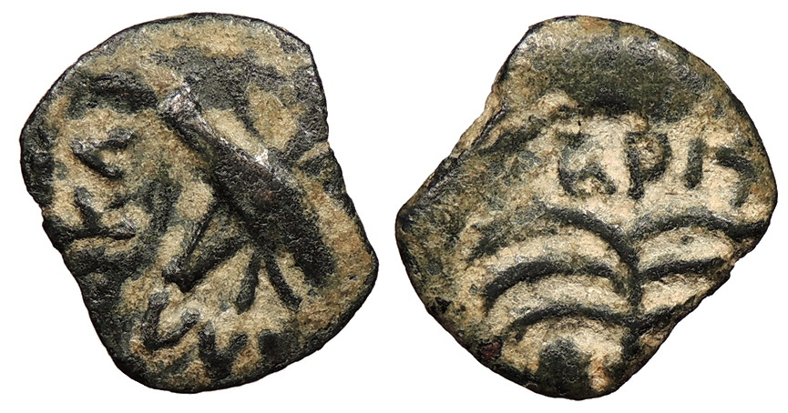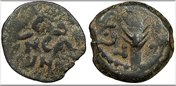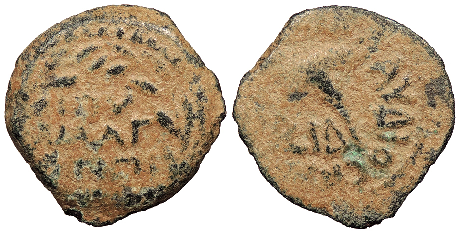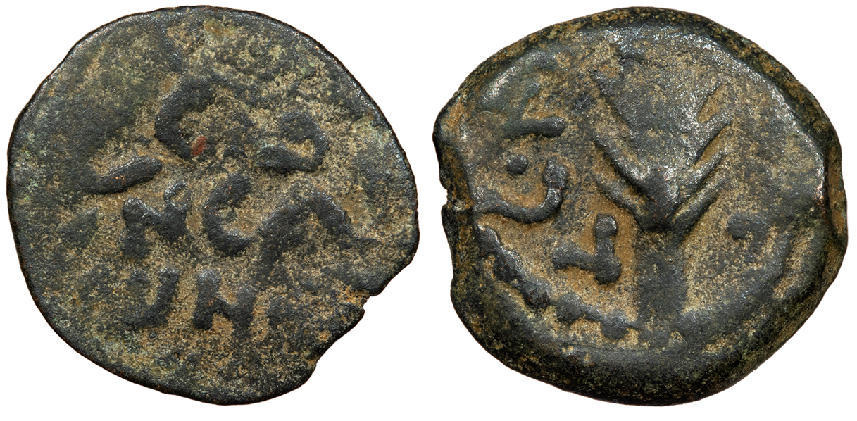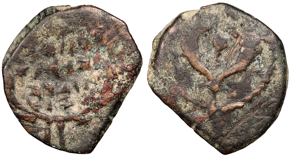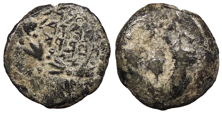 AE Prutah 14mm. 2.10g. Jerusalem mint Paleo-Hebrew ‘Yehohanan the High Priest and the Council of the Jews’ within wreath, in wedge style.