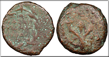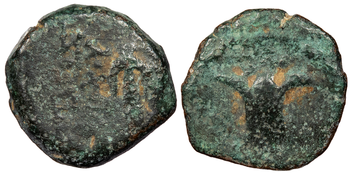 cf. Hendin 6165 About Fine. Dark green patina. Minor roughness, as typical. Though the date is off the flan, Seleukid Era year 181 is perhaps most likely. Struck after Hyrcanus' treaty with Seleukid king Antiochos VII Sidetes of Syria.