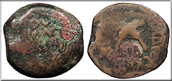 AE Prutah 18mm. 2.00g. Jerusalem mint Year 5 (58/59 A.D., under Nero) Legend in three lines within wreath tied with an X. NERWNOC Palm branch. LE KAISAROS Hendin 6380 Fine. Dark brown patina. Typical crude production. Irregular flan.