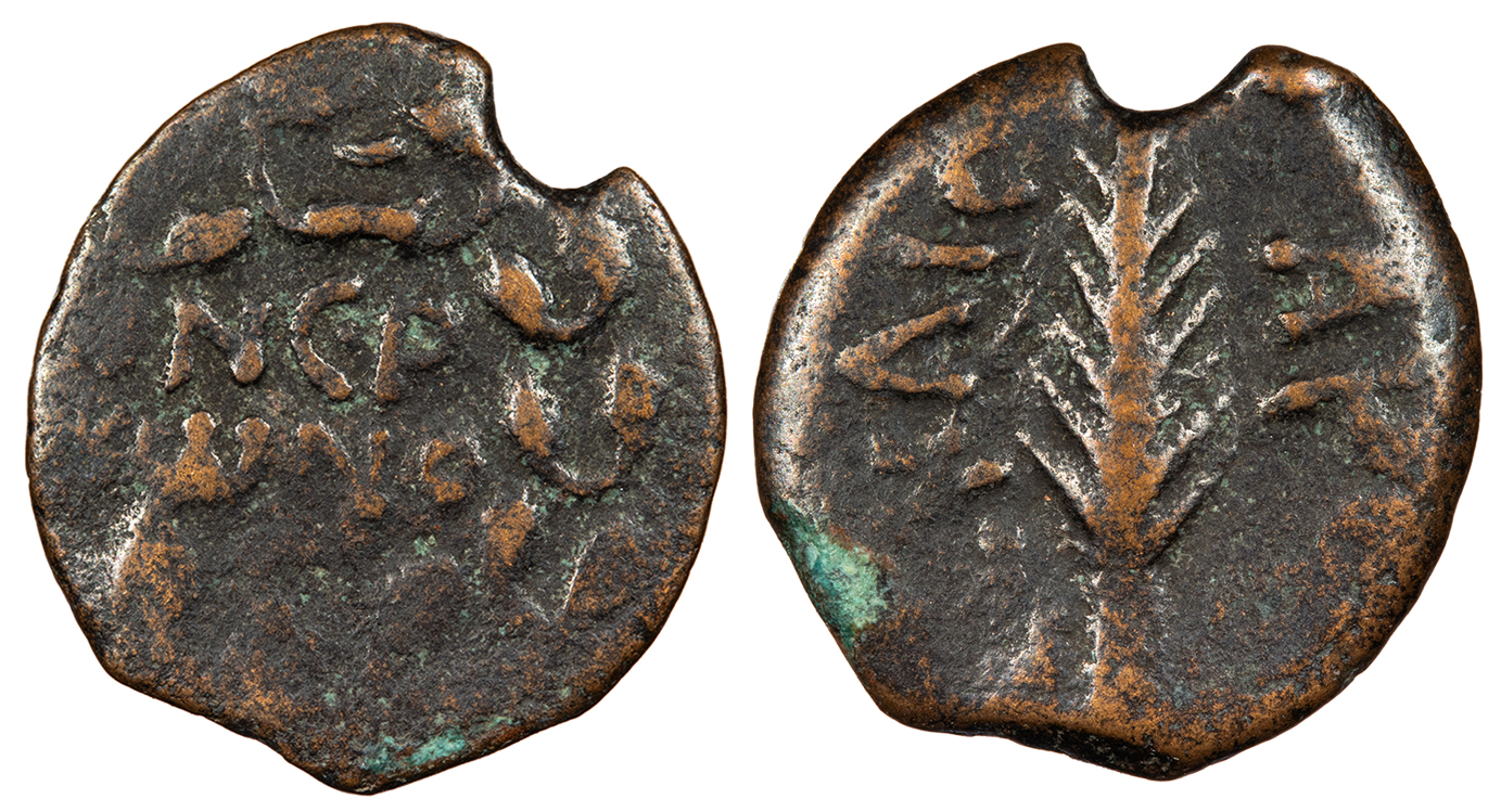 AE Prutah 16mm. 2.35g. Jerusalem mint Year 5 (58/59 A.D., under Nero) Legend in three lines within wreath tied with an X. NERWNOC Palm branch. LE KAISAROS Hendin 6380 Near VF. Dark patina with some tan fill. Clear date. Minor roughness, as typical.