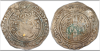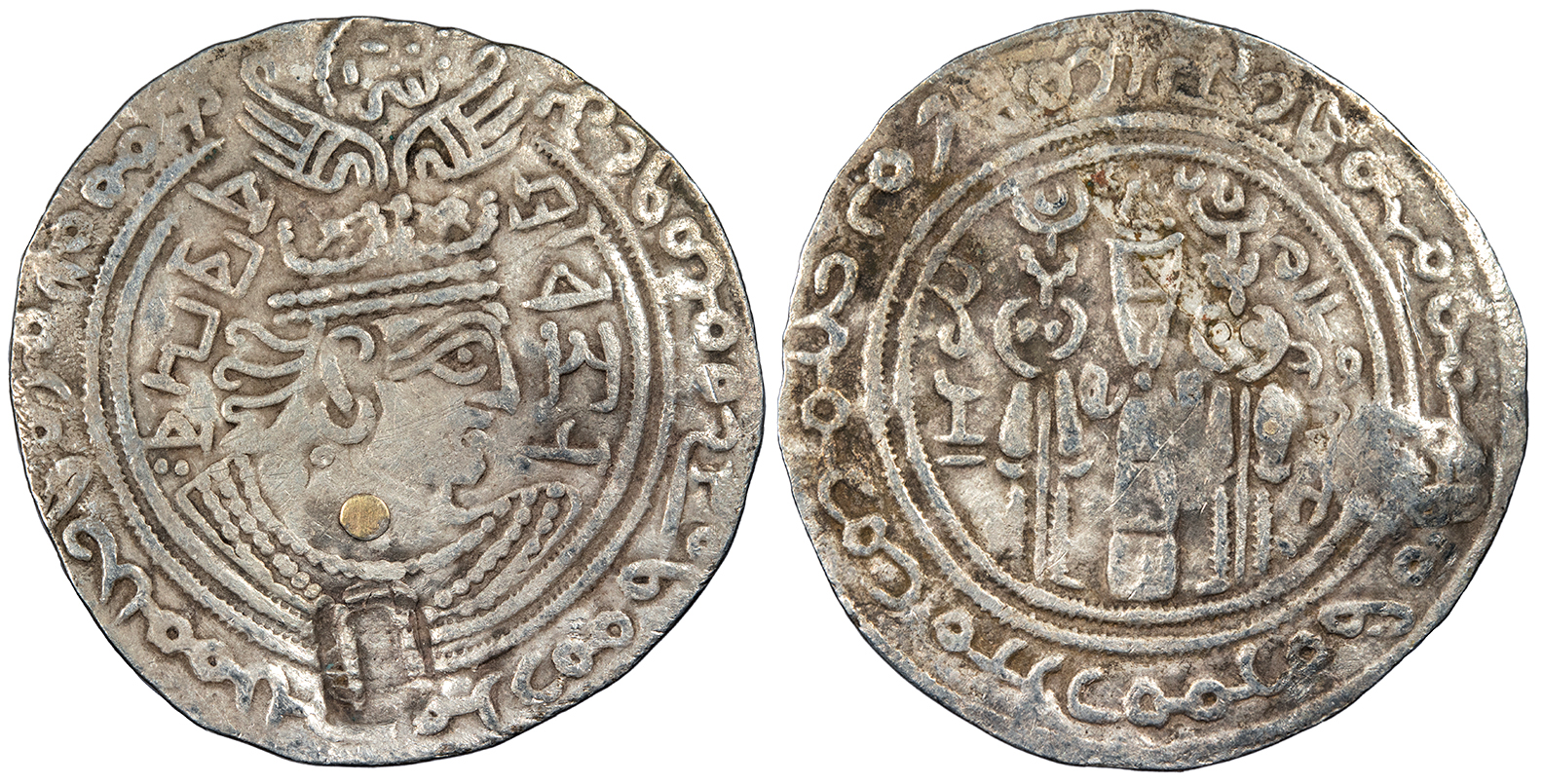 Vondrovec 244; c/m: Göbl, Dokumente KM 103 Good VF. Toned. Some porosity. This type features three languages - Baktrian, Brahmi, and Pahlavi - which pinpoints its issuance to Baktria. This issue was formerly cited as originating from the Shahi Turks or Nezak Huns, specifically to the reign of Shahi Tegin (Sri Shahi), but reassessment of the legends by Vondrovec has placed its origin to the north, in Baktria. Similarly, the issuer is now understood to be one named Sandan, of whom little is known, but whose name is attested in both the Baktrian and Brahmi legends. The Brahmi inscription also offers the title 'vakhudevah,' or 'Lord of the Oxus,' further evidencing a Baktrian origin. Later countermarking with dynastic tamgha symbols and the addition of a debased gold plug at the neck of the portrait were likely intended to raise its value. Reduced from: $140