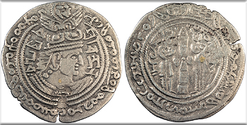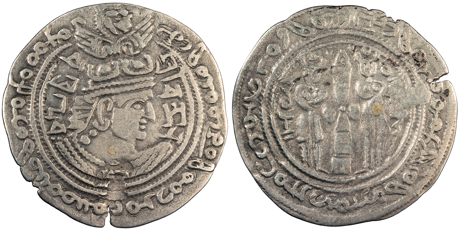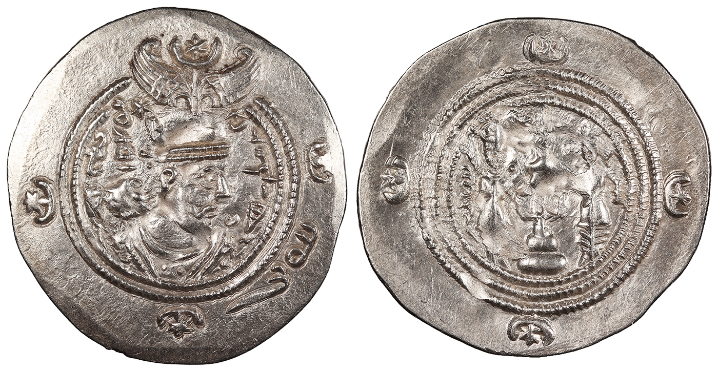 AR Drachm 32mm. 4.20g. RY 11 (601 A.D.) Bust r., wearing mural crown with frontal crescent, two wings, and surmounted by star in crescent; crescents on shoulders; stars flanking crown; double border with star-in-crescents and APD ('excellent' in Phalavi) around.