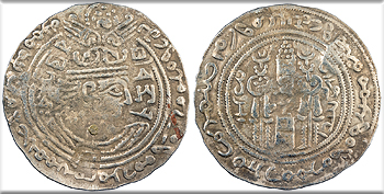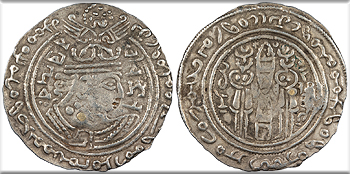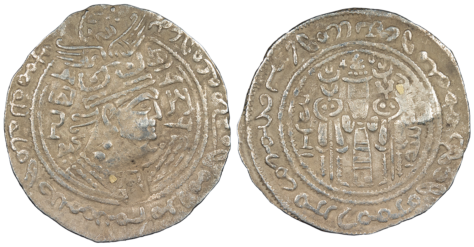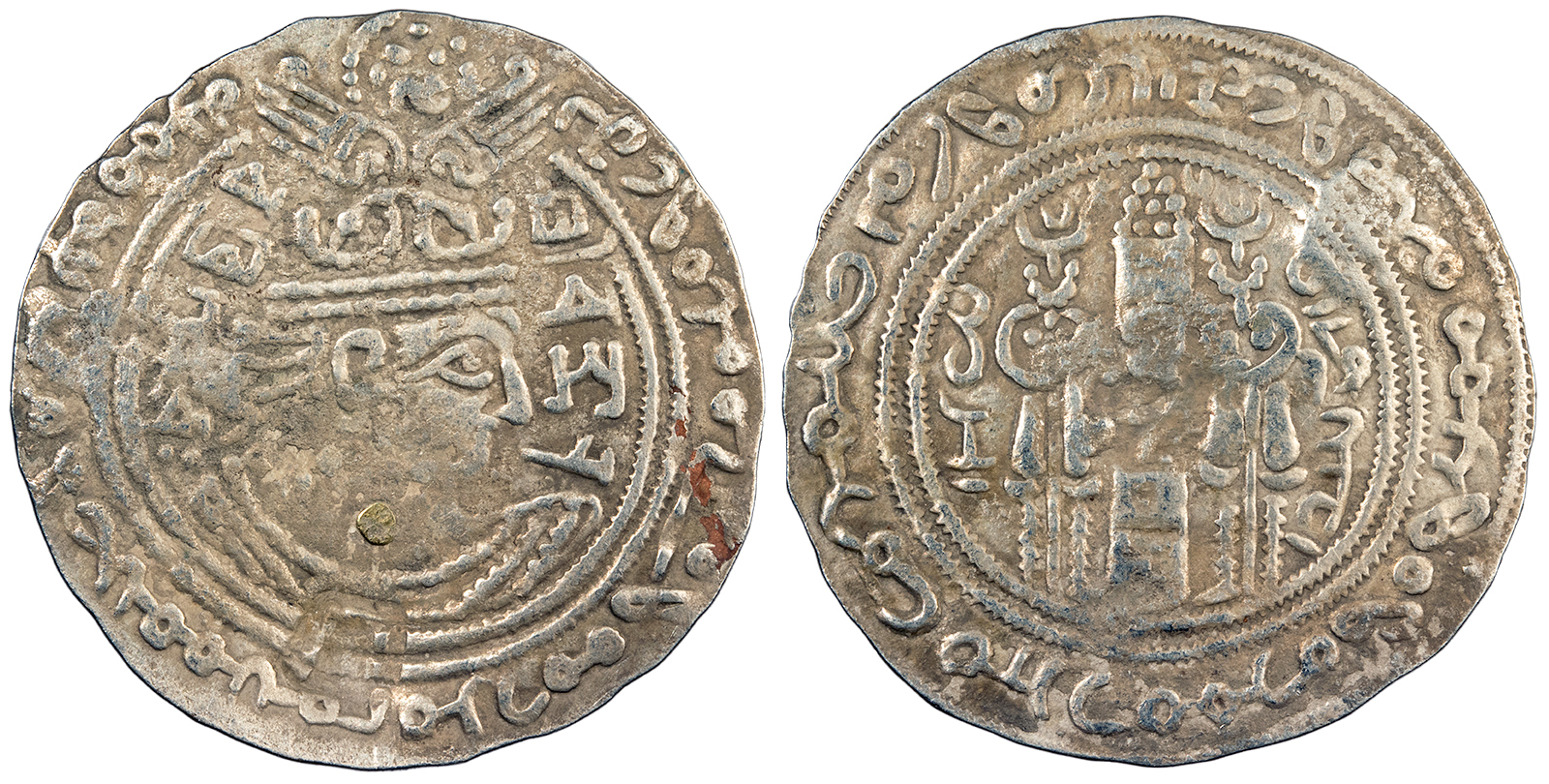 Album 2417 (c/m on Album 2405, tanka of Shahrukh struck at Saveh) VF. Toned. Host about VF. Both host and countermark show faint lustre in devices. Countermark unevenly applied. This common countermarked issue was struck by Abu Sa'id on top of older tankas, particularly those of Shahrukh (AH807-850).