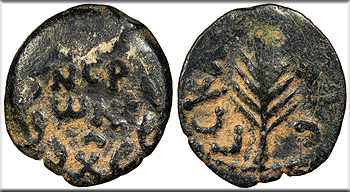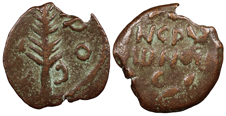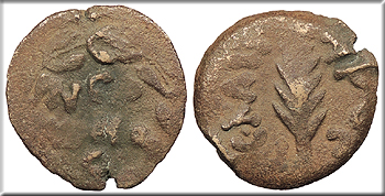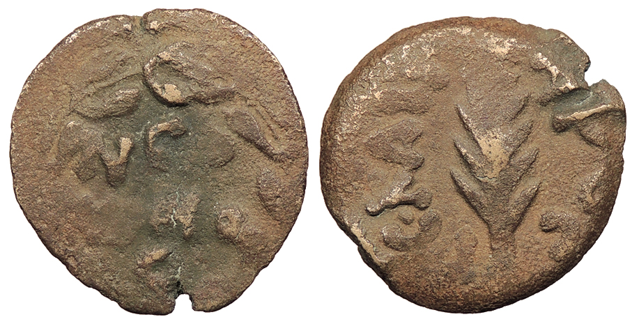 AE Prutah 16mm. 1.60g. Jerusalem Mint Year 5 (of Nero, 58/59 A.D.) Legend within wreath tied and bottom with an X. NER / WNO / C Palm branch. [LE KAISA]ROS Hendin 1351 Good Fine. Brown patina with green contrast. Crude manufacture with slight porosity, as typical.