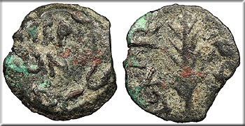 AE Prutah 14mm. 1.70g. Jerusalem Mint Year 5 (of Nero, 58/59 A.D.) Legend within wreath tied and bottom with an X. NER/WN[O/C] Palm branch. LE KAISARO[S] Hendin 1351 Fine. Green patina. Light roughness and encrustations.