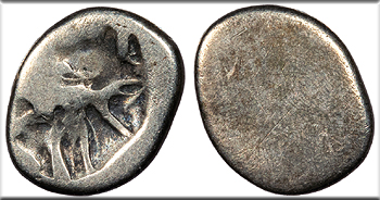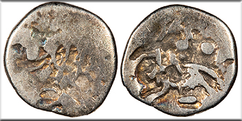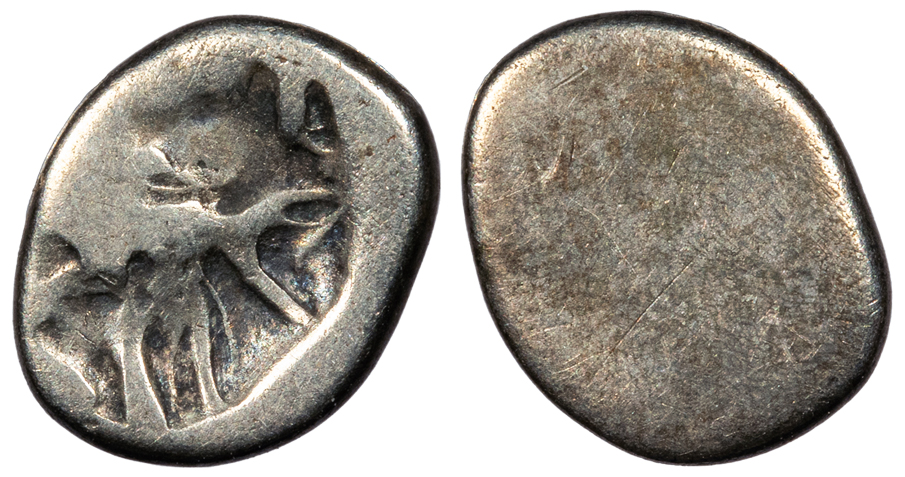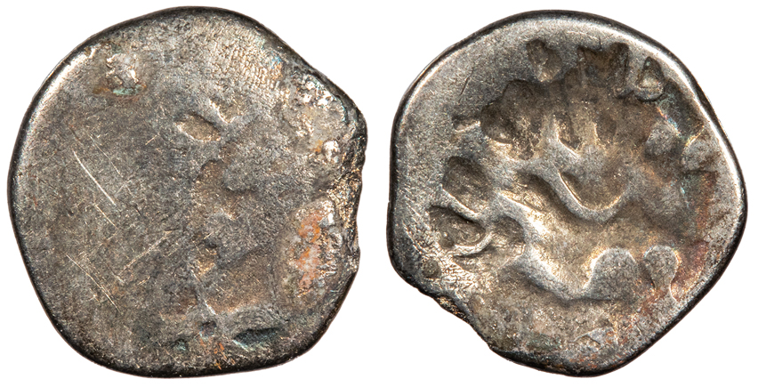cf. Fishman & Todd, Y12 VF. Lightly toned and with lustre in recesses. Rare. Crudely produced, as typical. Struck with very worn obverse die. A recently identified pre-Islamic type. While this example initially appears to be uniface, the reverse matches that of the highly stylized bull types, which were struck with increasingly poor quality and worn-out obverse dies; we believe this is an example struck with an almost obliterated obverse die. According to Fishman & Todd, Rana Vigraha can be identified as Jayasimha, the last ruler of Sind before the Arab invasion. This crude series is thought to have been struck during his exile following his defeat.